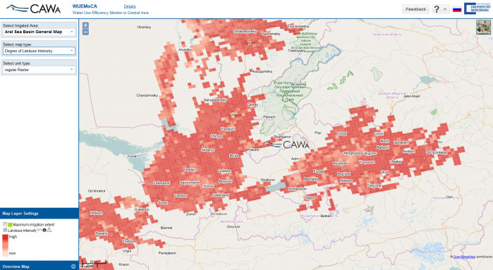 WUEMoCA is an online GIS-based tool for the regional monitoring of irrigated areas in Central Asia. The tool is being developed by Wuerzburg University in cooperation with SIC ICWC in the frame of CAWa phase III. It contains detailed annual maps of land use and crop yields based on openly accessible medium-resolution optical satellite data (MODIS, and for pilot regions Landsat) for the period after year 2000. In the mid-term, automated processing of newly incoming data will allow for the operational use of this tool in land and water management institutions across Central Asia. Potential future applications include assessments of marginal lands with low productivity, the intensity of land use, the early estimation of harvest shortfalls, and the assessment of water use efficiencies.